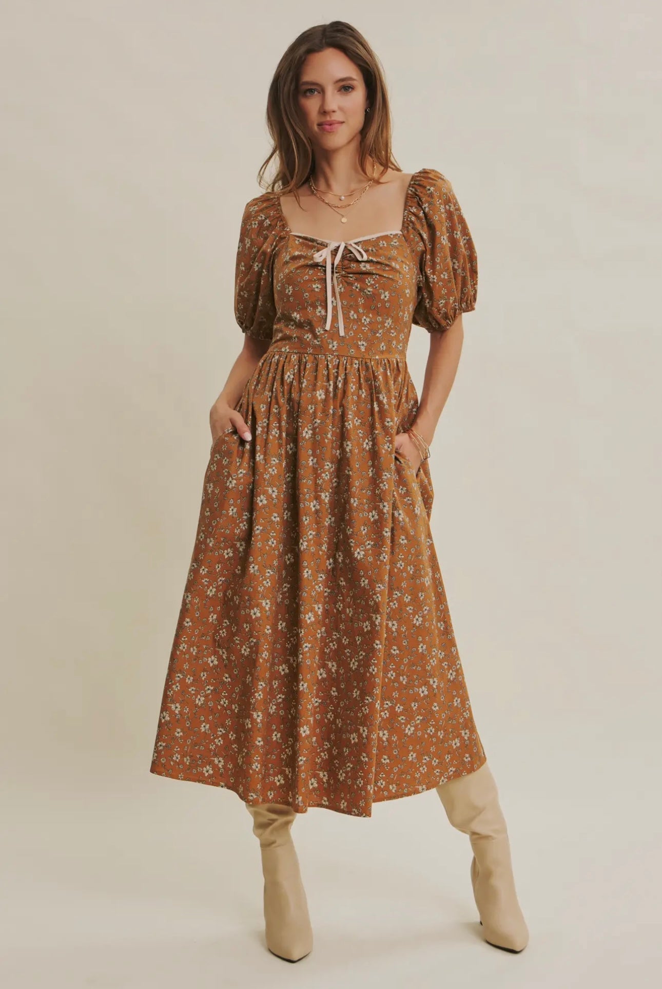 Softly rutched bust, and sweet contrast bow detail. Designed for the romantic at heart, it features voluminous puff sleeves and a flattering square neckline. The smocked back offers comfortable stretch, making it both fitted and forgiving for everyday ease or special fall occasions. Crafted from breathable cotton and fully lined, it moves beautifully through crisp afternoons and cozy gatherings alike. With hidden side pockets and a timeless floral print. Ideal for fall, weddings, weekend brunch, or spring events.